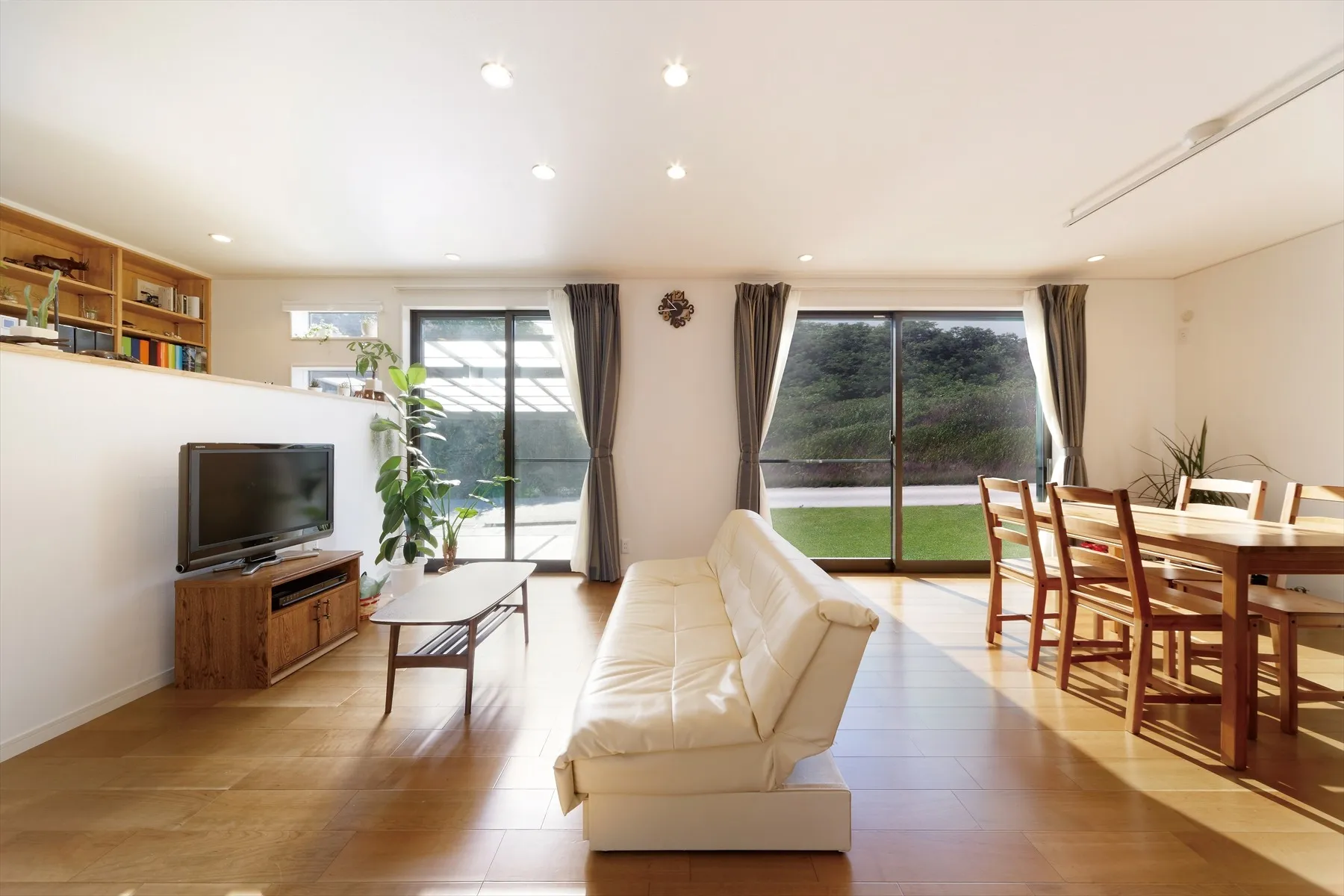 例えば、無垢材のフローリングや白を基調とした壁に、グレーやベージュのソファ、観葉植物を配置した実例では、自然光がたっぷり差し込む明るい室内になります。さらに、収納やカーテンもシンプルなものを選ぶことで、空間全体に統一感が生まれます。ナチュラルモダンは家族の生活動線も考慮しやすく、快適な新築インテリアとしておすすめです。
