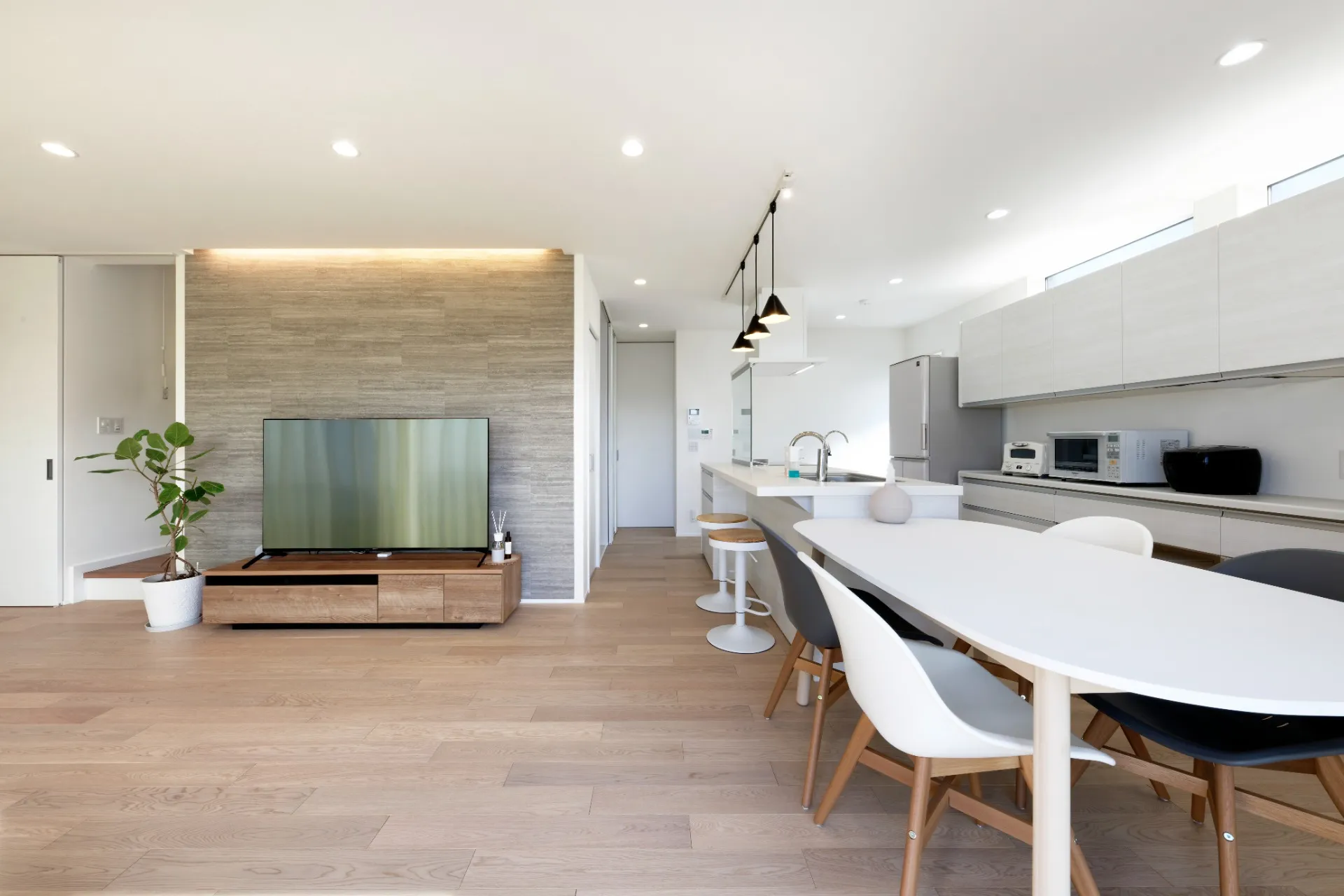 ホテルライクな新築住宅の空間づくりで重視すべきは、「共用空間」と「プライベート空間」のバランスです。家族全員が集まるリビングやダイニングは、広々とした設計と上質な素材選びで、ホテルのラウンジのような居心地を目指します。