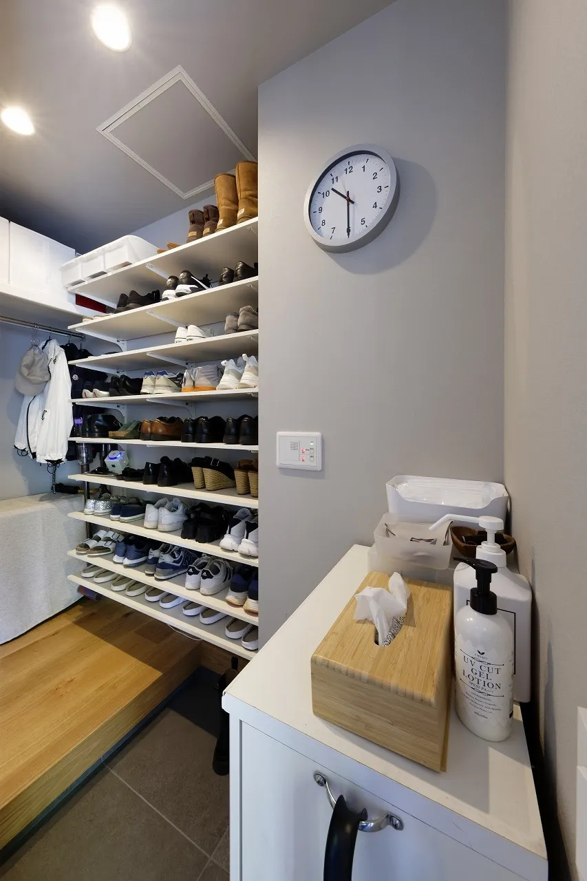 例えば、玄関脇に設けるシューズクロークは、靴以外にもベビーカーやスポーツ用品、アウトドアグッズなどをまとめて収納できるため、家の中への持ち込みを防ぎ清潔感を保てます。また、収納内部に照明を設置することで、夜間や雨の日でも見やすく取り出しやすい環境をつくることができます。